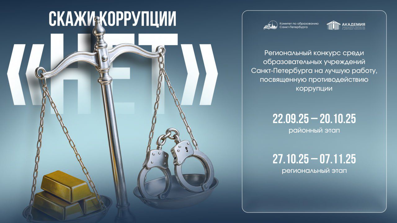 Объявлен региональный конкурс на лучшую работу, посвященную противодействию коррупции, среди общеобразовательных учреждений. На конкурс приглашаются учащиеся Санкт-Петербурга в возрасте от 11 до 17 лет. Этот конкурс — не просто творческое состязание. Он призван сформировать у подрастающего поколения нетерпимое отношение к коррупциии, воспитать честность и ответственность, а также укрепить доверие к государственным институтам. Номинации: · «Социальный