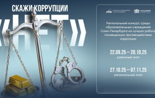 Объявлен региональный конкурс на лучшую работу, посвященную противодействию коррупции, среди общеобразовательных учреждений. На конкурс приглашаются учащиеся Санкт-Петербурга в возрасте от 11 до 17 лет. Этот конкурс — не просто творческое состязание. Он призван сформировать у подрастающего поколения нетерпимое отношение к коррупциии, воспитать честность и ответственность,