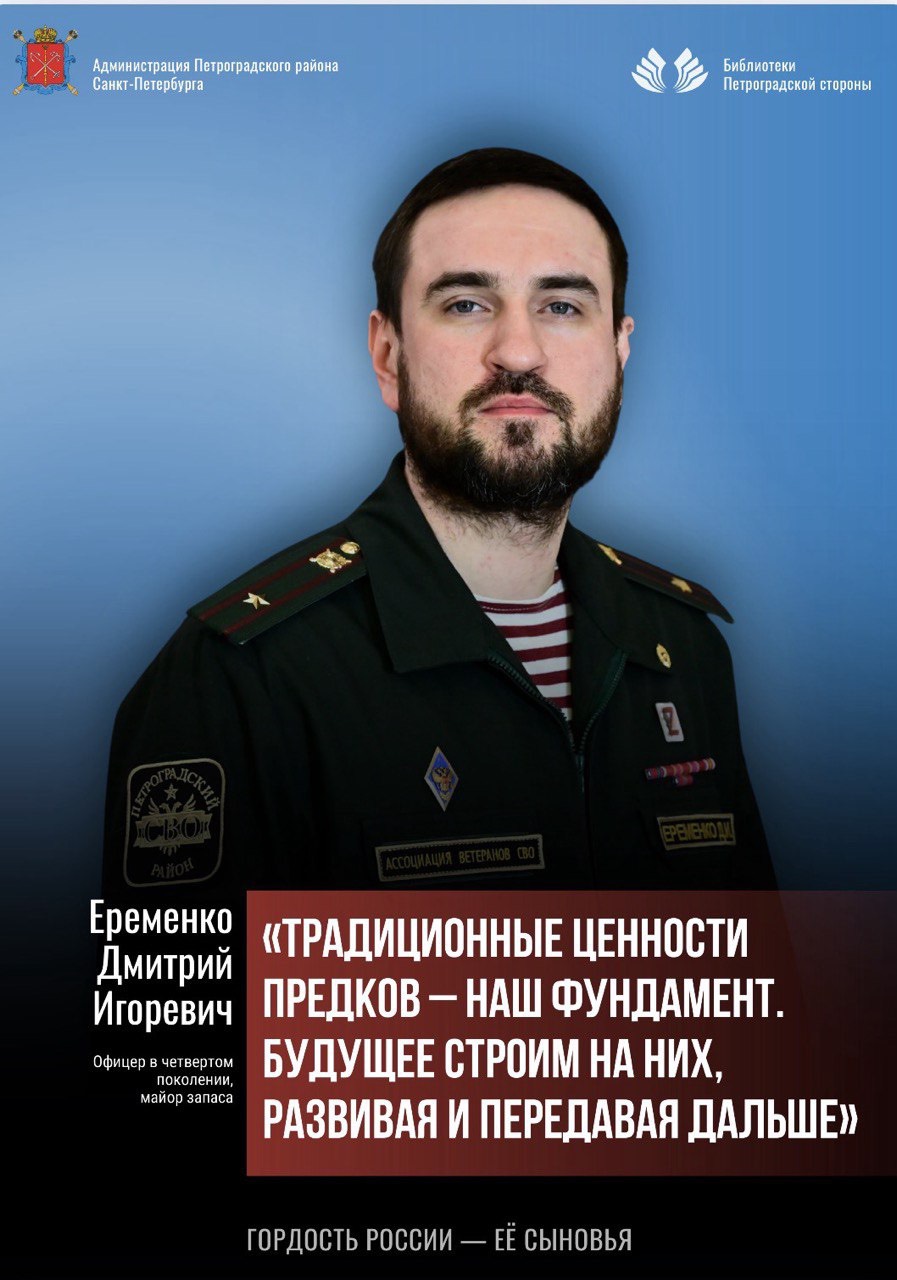 🔹Д.И. Еременко — майор запаса, заместитель руководителя районного отделения Ассоциации ветеранов СВО «Защитники Родины» Петроградского района. Дмитрий Игоревич — офицер в четвертом поколении, прослужил в войсках 18 лет. Прошел большой боевой путь на территории России и Донбасса в период СВО, также был в Чеченской республике, участвовал в контртеррористической операции в Ингушетии.